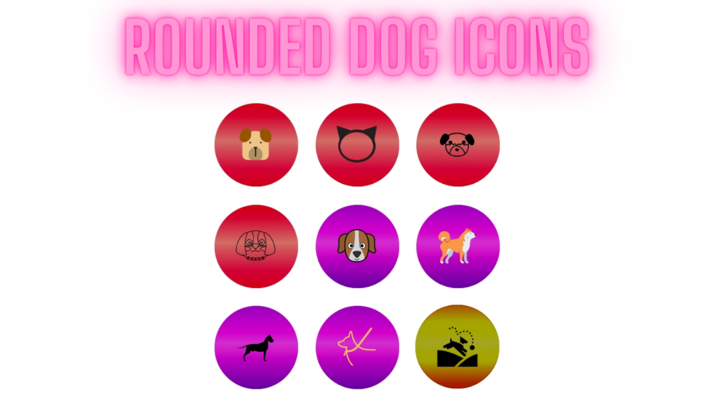 This is a set of 33 images of dogs on four different colored circles, meaning there are 132 unique icons in this package. The backgrounds are gold, purple, blue and green. Each icon is available in the following formats: